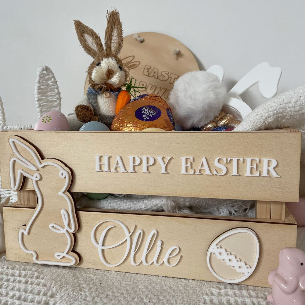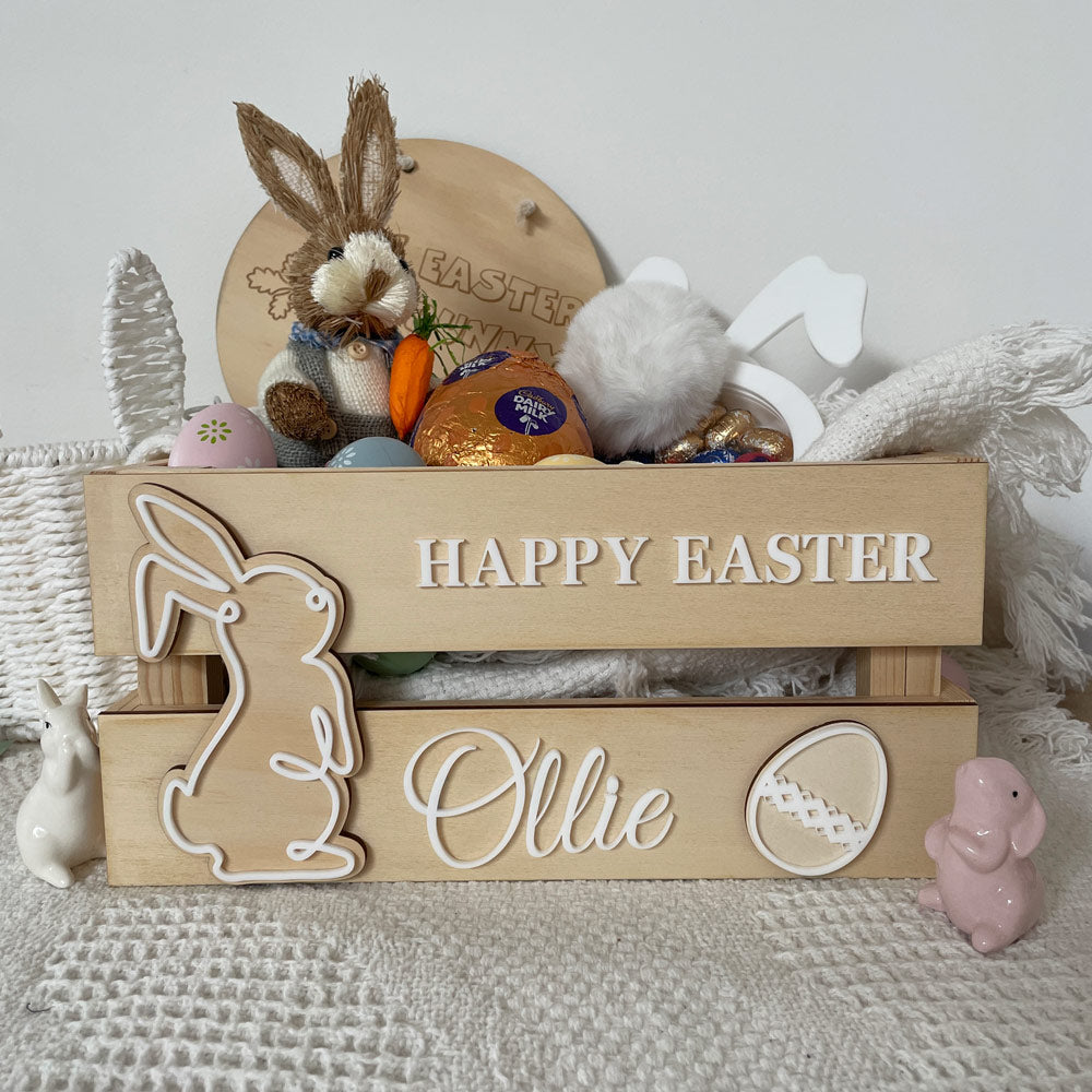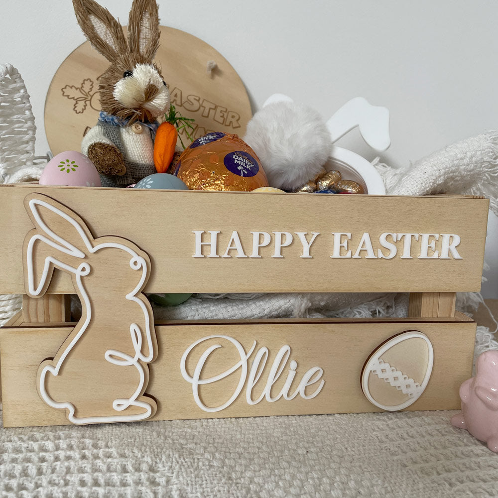 PERSONALISED WOODEN EASTER CRATE - WHITE ACRYLIC EASTER BUNNY
